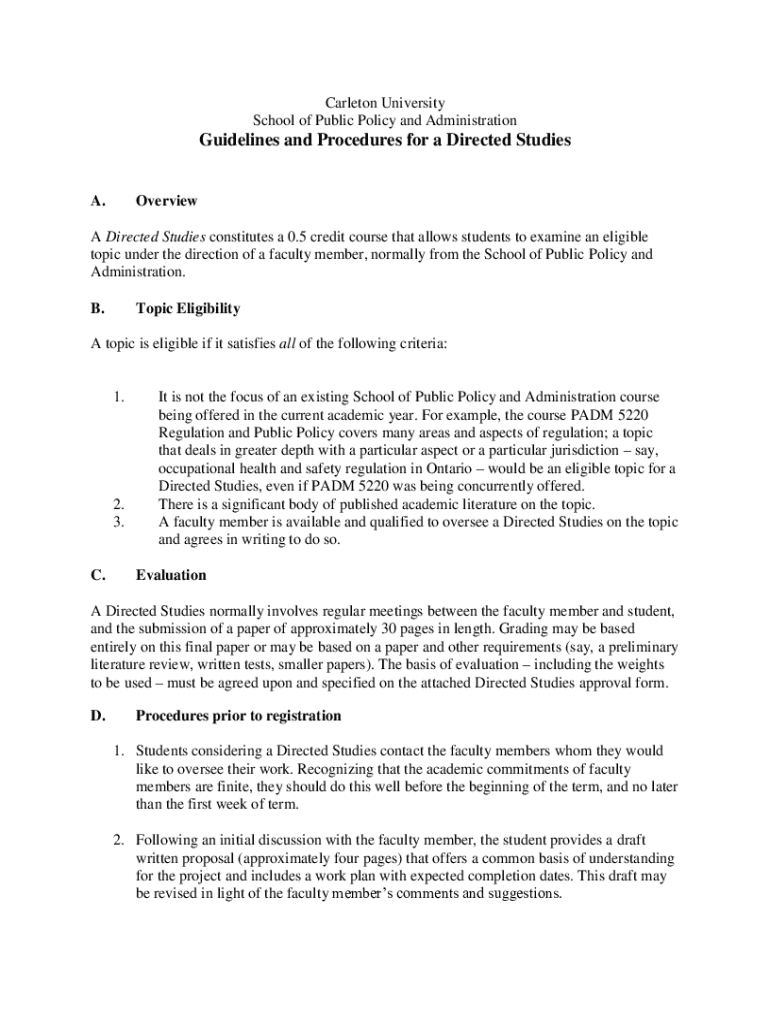 Carleton University School of Public Policy and AdministrationGuidelines and Procedures for a Directed Studies. OverviewA Directed Studies constitutes a 0.5 credit course that allows students to examine
