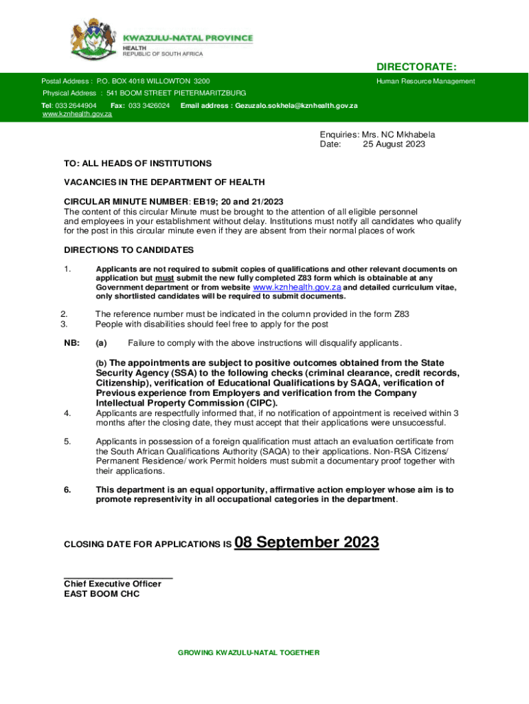 DIRECTORATE: Postal Address : P.O. BOX 4018 WILLISTON 3200Human Resource ManagementPhysical Address : 541 BOOM STREET PIETERMARITZBURG Tells: 033 2644904 Fax: 033 3426024 www.kznhealth.gov.zaEmail