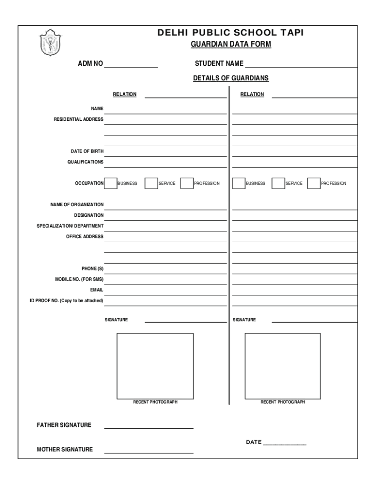 DELHI PUBLIC SCHOOL TAPI GUARDIAN DATA FORM STUDENT NAME ADM DETAILS OF GUARDIANS RELATIONRELATIONNAME RESIDENTIAL ADDRESSABLE OF BIRTH QUALIFICATIONSOCCUPATIONBUSINESSSERVICEPROFESSIONBUSINESSSERVICENAME