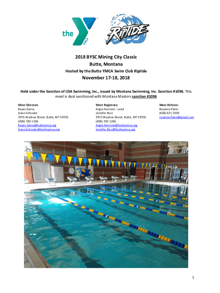 2018 BSC Mining City Classic Butte, Montana Hosted by the Butte YMCA Swim Club Riptide November 1718, 2018 Held under the Sanction of USA Swimming, Inc., issued by Montana Swimming, Inc. Sanction
