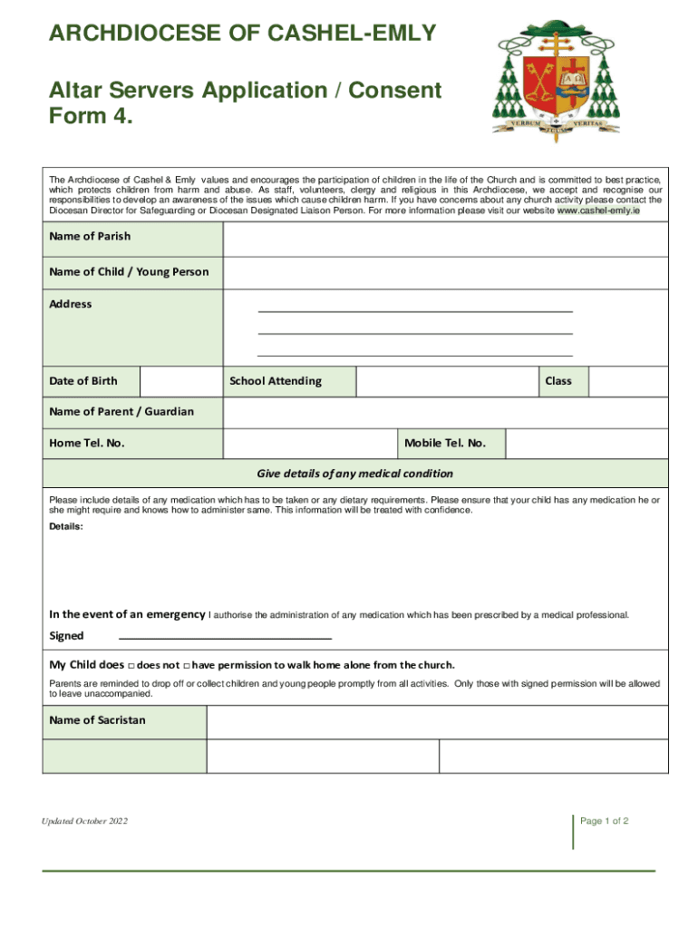 ARCHDIOCESE OF CASHELEMLY Altar Servers Application / Consent Form 4. The Archdiocese of Cashed & Emily values and encourages the participation of children in the life of the Church and is committed