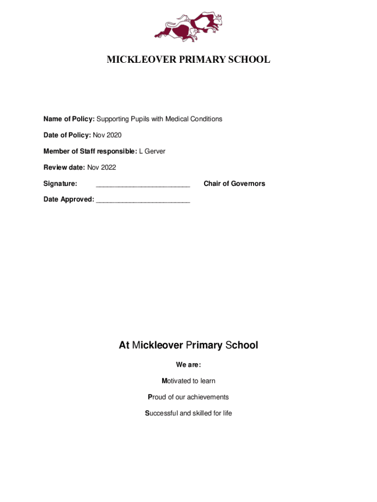 MAKEOVER PRIMARY Schoolmate of Policy: Supporting Pupils with Medical Conditions Date of Policy: Nov 2020 Member of Staff responsible: L Server Review date: Nov 2022 Signature:___Chair of Governorate