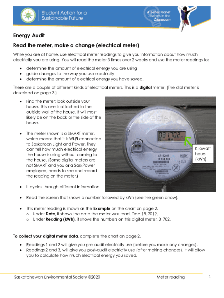 Energy Audit Read the meter, make a change (electrical meter) While you are at home, use electrical meter readings to give you information about how much electricity you are using. You will read the