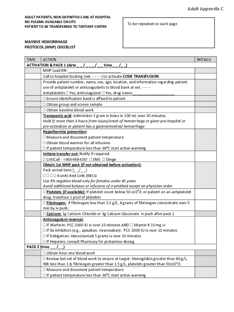 Adult Appendix C ADULT PATIENTS, DEFINITIVE CARE AT HOSPITAL NO PLASMA AVAILABLE ON SITE PATIENT TO BE TRANSFERRED TO TERTIARY Center be repeated on each pageMASSIVE HEMORRHAGE PROTOCOL (MHP) CHECKLIST