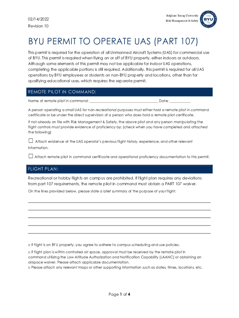 Brigham Young University02/14/2022Risk Management & SafetyRevision 10BYU PERMIT Operating UAS (PART 107) This permit is required for the operation of all Unmanned Aircraft Systems (UAS) for commercial