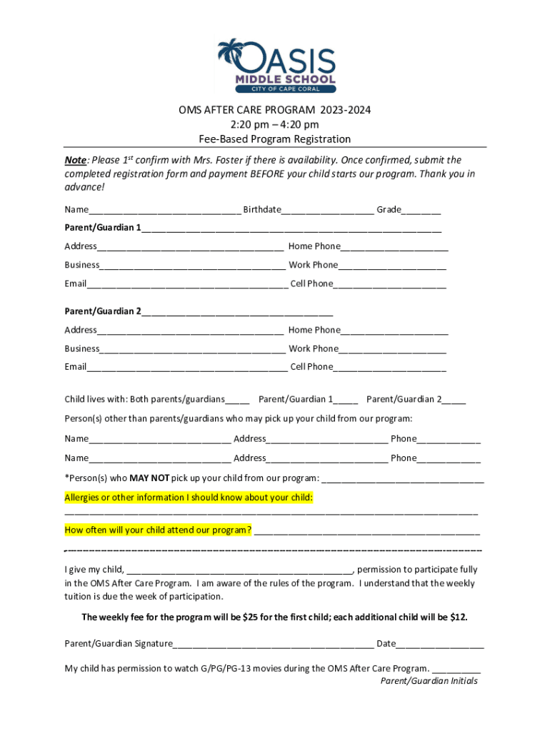 OMS AFTER CARE PROGRAM 20232024 2:20 pm 4:20 pm Freebased Program Registration Note: Please 1st confirm with Mrs. Foster if there is availability. Once confirmed, submit the completed registration