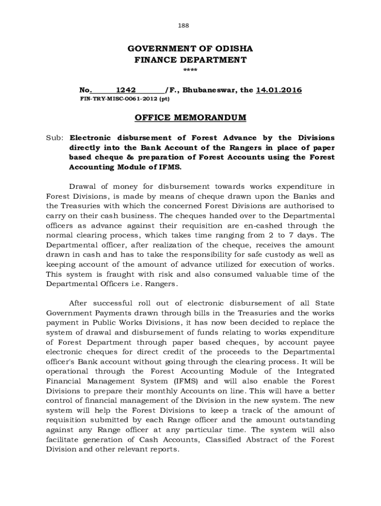 188GOVERNMENT OF ODISHA FINANCE DEPARTMENT ****No.1242/F., Bhubaneswar, the 14.01.2016FINTRYMISC00612012 (pt)OFFICE MEMORANDUM Sub: Electronic disbursement of Forest Advance by the Divisions directly