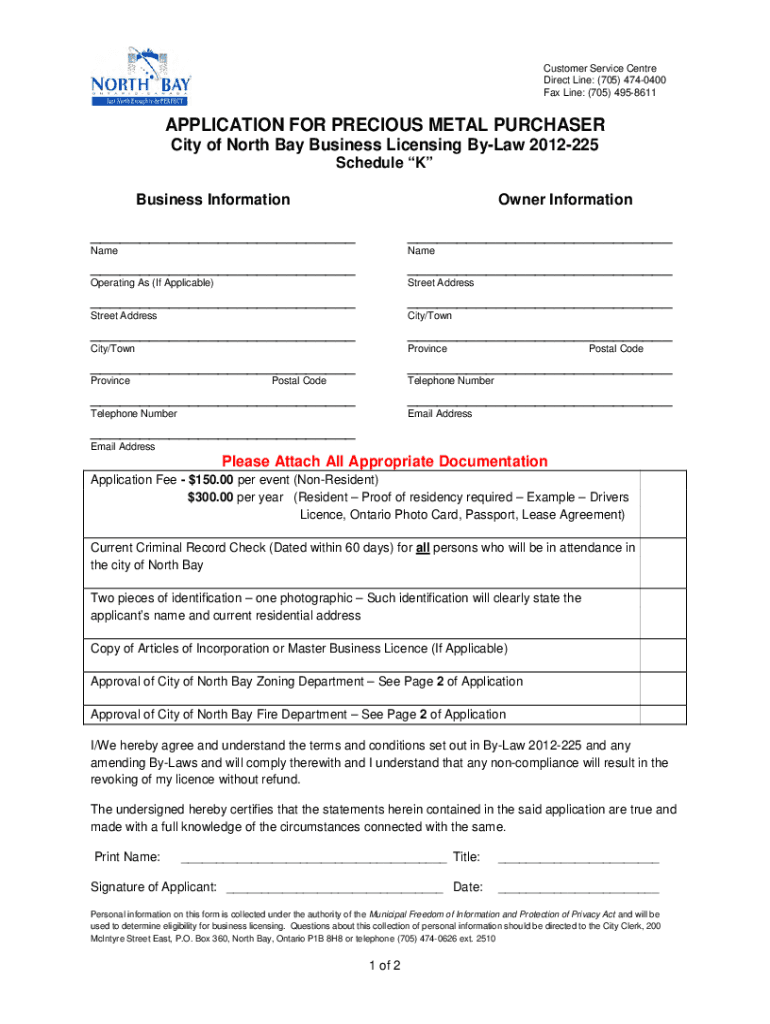 Customer Service Center Direct Line: (705) 4740400 Fax Line: (705) 4958611APPLICATION FOR PRECIOUS METAL PURCHASER City of North Bay Business Licensing Bylaw 2012225 Schedule K Business InformationOwner