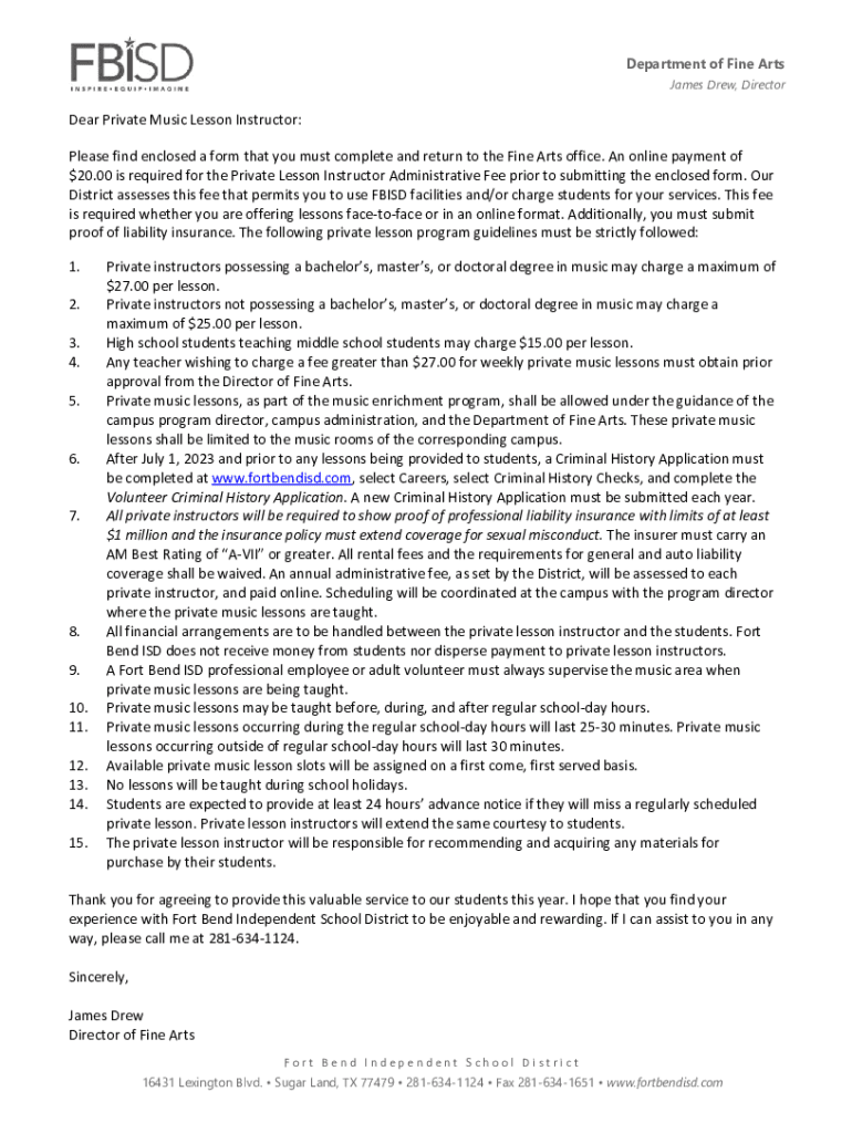 Department of Fine Arts James Drew, Directories Private Music Lesson Instructor: Please find enclosed a form that you must complete and return to the Fine Arts office. An online payment of $20.00