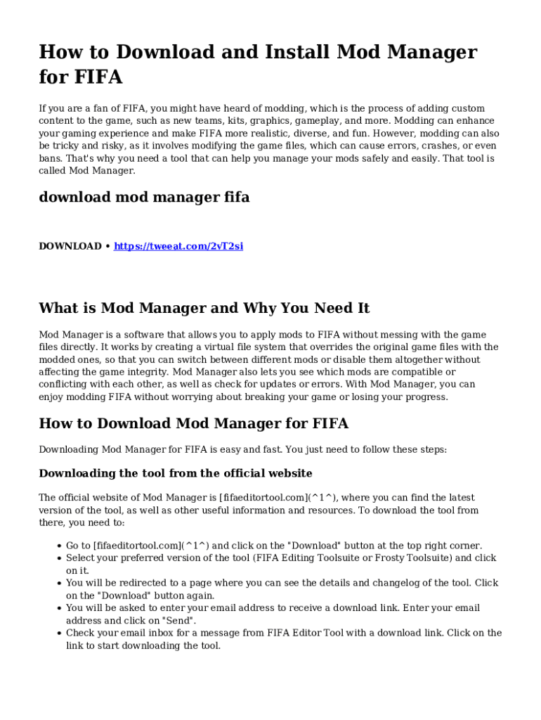 How to Download and Install Mod Manager for FIFA If you are a fan of FIFA, you might have heard of modding, which is the process of adding custom content to the game, such as new teams, kits, graphics,