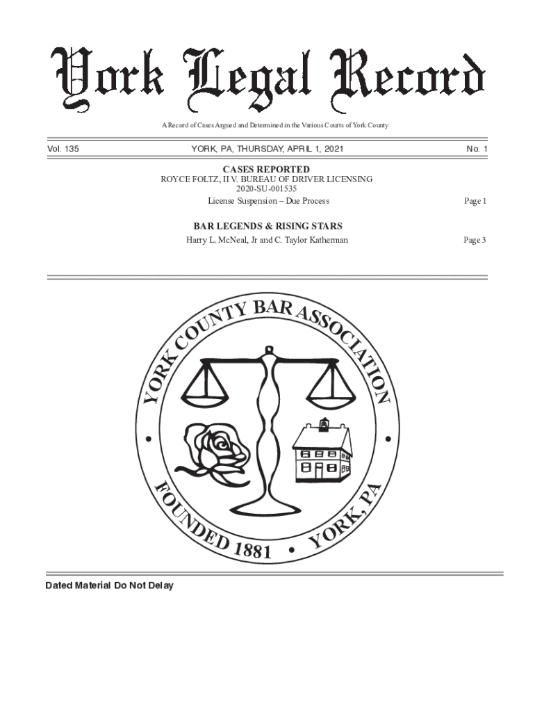 A Record of Cases Argued and Determined in the Various Courts of York Control. 135YORK, PA, THURSDAY, APRIL 1, 2021No. 1CASES REPORTEDROYCE FOL TZ, II V. BUREAU OF DRIVER LICENSING