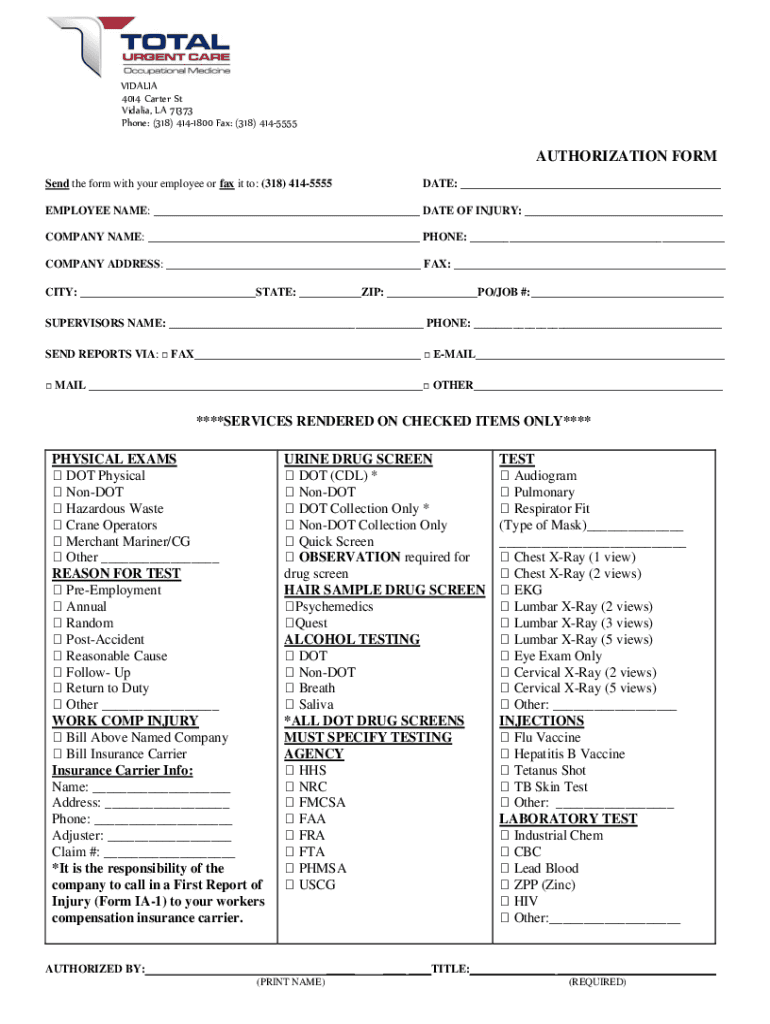 VISALIA 4014 Carter St Visalia, LA 71373 Phone: (318) 4141800 Fax: (318) 4145555AUTHORIZATION FORM Send the form with your employee or fax it to: (318) 4145555DATE: ___EMPLOYEE NAME: ___ DATE OF INJURY: