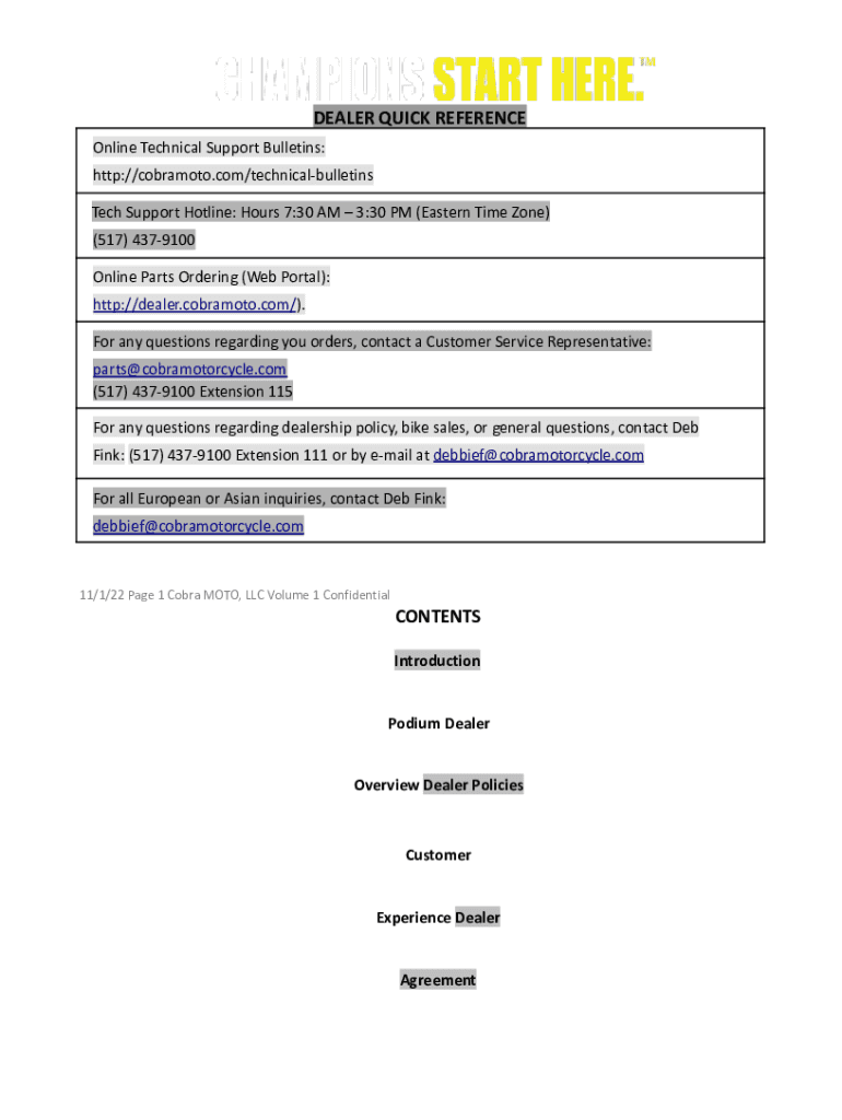 DEALER QUICK REFERENCE Online Technical Support Bulletins: http://cobramoto.com/technicalbulletins Tech Support Hotline: Hours 7:30 AM 3:30 PM (Eastern Time Zone) (517) 4379100 Online Parts Ordering