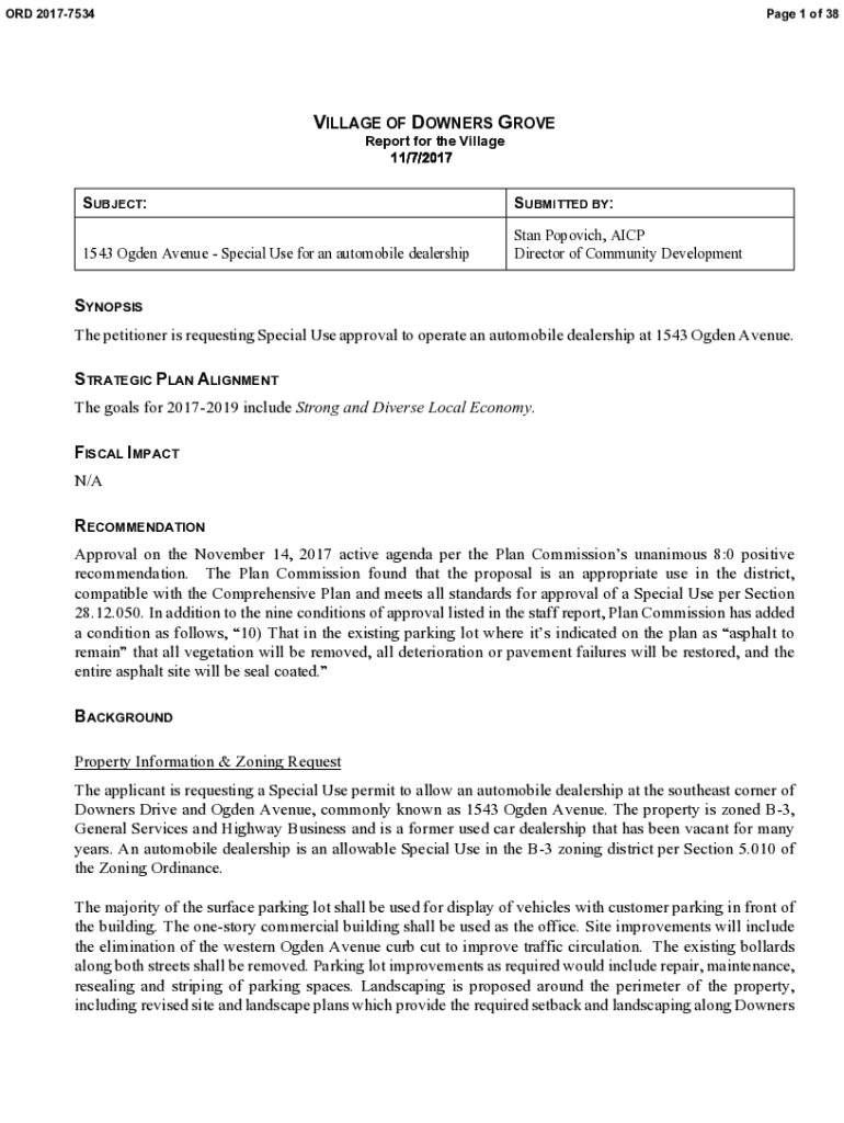 ORD 20177534Page 1 of 38VILLAGE OF DOWNERS GROVE Report for the Village 11/7/2017SUBJECT:SUBMITTED BY:1543 Ogden Avenue Special Use for an automobile dealership Stan Pooch, ICP Director of Community