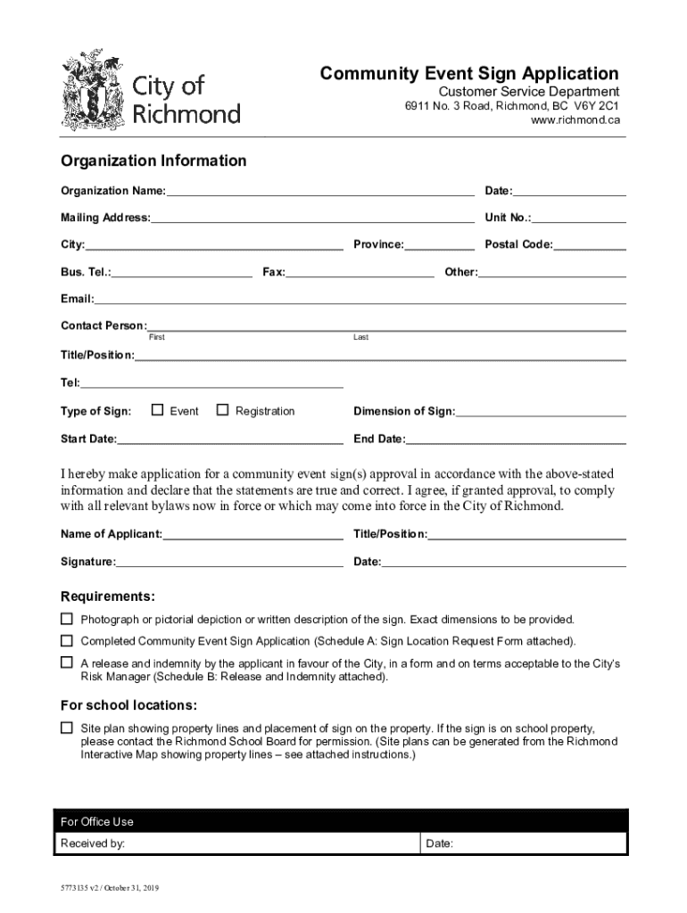 Community Event Sign Application Customer Service Department 6911 No. 3 Road, Richmond, BC V6Y 2C1 www.richmond.caOrganization Information Organization Name:Date:Mailing Address:Unit No.:City:Province:Bus.