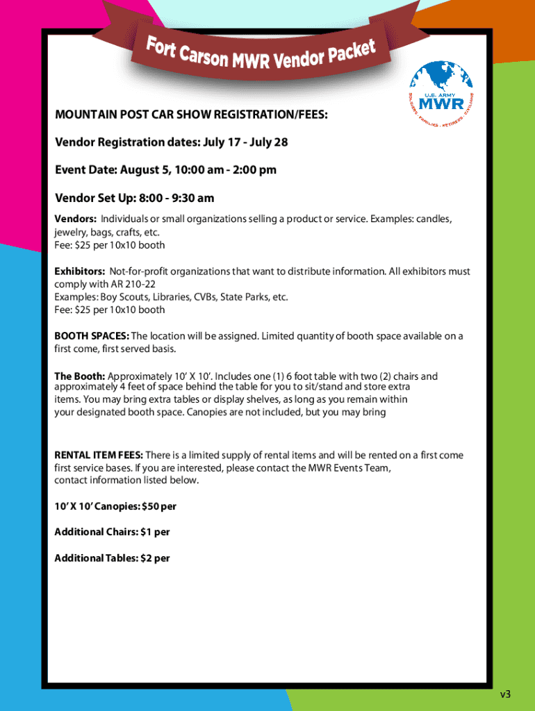 MOUNTAIN POST CAR SHOW REGISTRATION/FEES: Vendor Registration dates: July 17 July 28 Event Date: August 5, 10:00 am 2:00 pm Vendor Set Up: 8:00 9:30 vendors: Individuals or small organizations selling