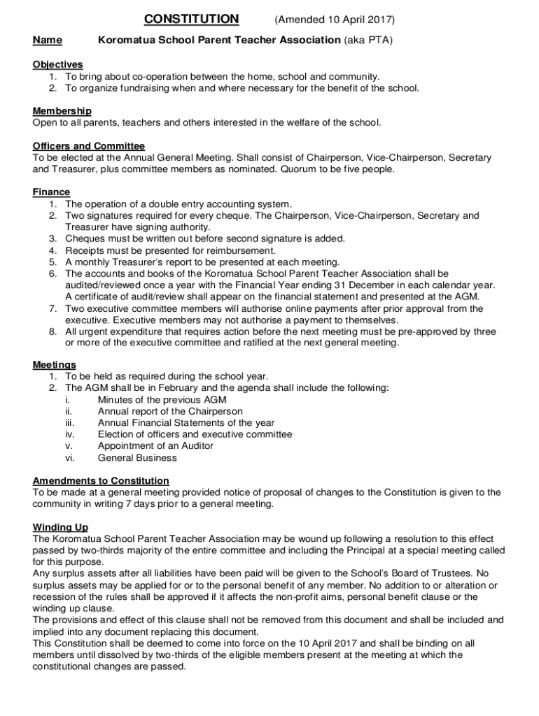 CONSTITUTION Name(Amended 10 April 2017)Korematsu School Parent Teacher Association (aka PTA)Objectives 1. To bring about cooperation between the home, school and community. 2. To organize fundraising