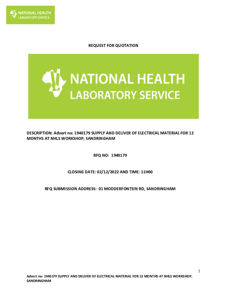 REQUEST FOR QUOTATIONDESCRIPTION: Advert no: 1940179 SUPPLY AND DELIVER OF ELECTRICAL MATERIAL FOR 12 MONTHS AT NHS WORKSHOP, SANDRINGHAMRFQ NO: 1940179CLOSING DATE: 02/12/2022 AND TIME: 11H00RFQ