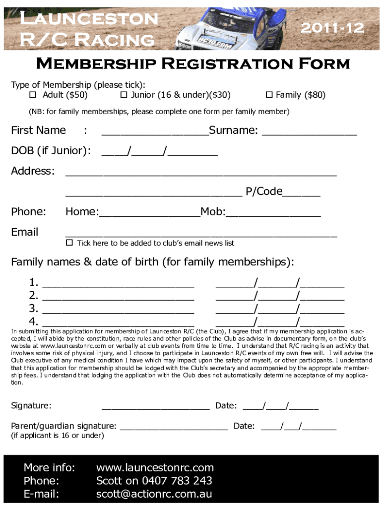 Launceston R/C Racing2011201112Membership Registration Form Type of Membership (please tick): Adult ($50) Junior (16 & under)($30) Family ($80)(NB: for family memberships, please complete one form