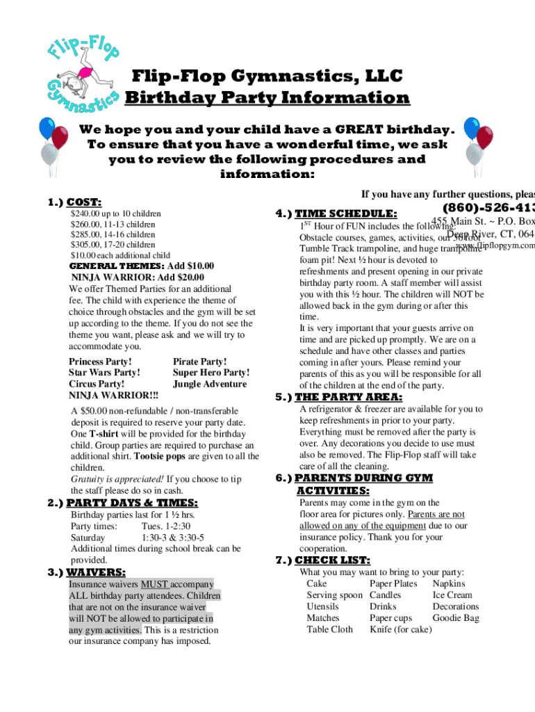 Flip-flops Gymnastics, LLC Birthday Party Information We hope you and your child have a GREAT birthday. To ensure that you have a wonderful time, we ask you to review the following procedures and