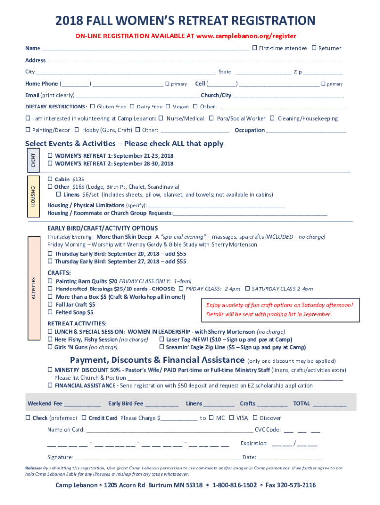 2018 FALL WOMEN RETREAT REGISTRATION ONLINE REGISTRATION AVAILABLE AT www.camplebanon.org/register Name ___ First time attendee Returner Address ___ City ___ State ___ Zip ___ Home Phone (___) ___