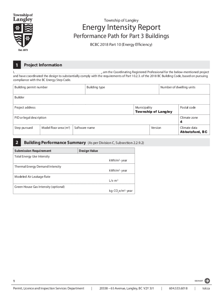 Township of LangleyEnergy Intensity Report Performance Path for Part 3 Buildings BBC 2018 Part 10 (Energy Efficiency)1Project Information, ,, am the Coordinating Registered Professional for the below