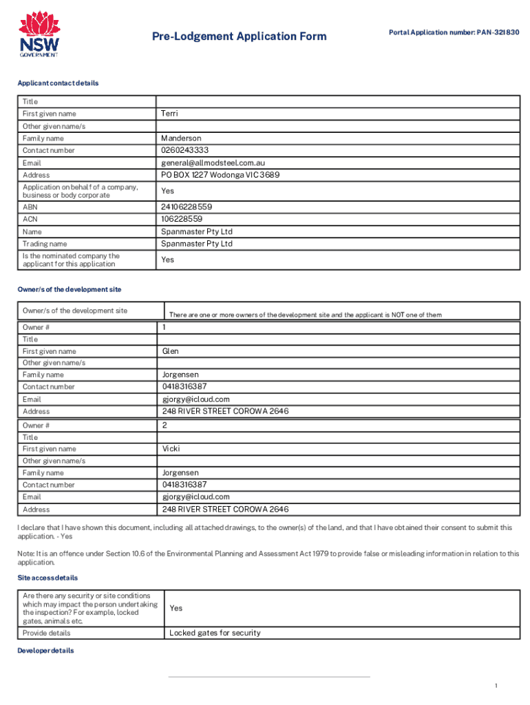 Prejudgment Application Corporal Application number:PAN321830 Applicant contact detailsTitleFirst given nameTerriOther given name/family nameMandersonContact number0260243333Emailgeneral@allmodsteel.com.auAddressPO