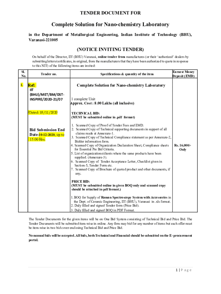 TENDER DOCUMENT Complete Solution for Biochemistry Laboratory in the Department of Metallurgical Engineering, Indian Institute of Technology (BHU), Varanasi221005(NOTICE INVITING TENDER) On behalf