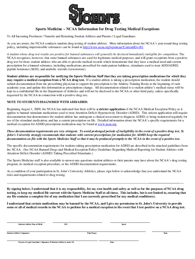 Sports Medicine NCAA Information for Drug Testing Medical Exceptions To All Incoming Freshmen / Transfer and Returning Student Athletes and Parents / Legal Guardians: As you are aware, the NCAA conducts