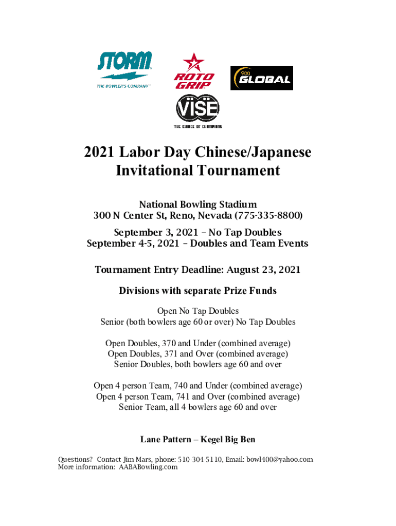 2021 Labor Day Chinese/Japanese Invitational Tournament National Bowling Stadium 300 N Center St, Reno, Nevada (7753358800) September 3, 2021, No Tap Doubles September 45, 2021 Doubles and Team Events