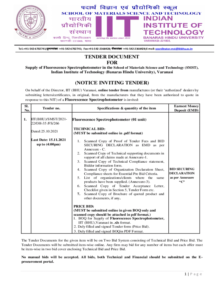 Tel.:+915426702741;nwjHkkkla[;k %+915426702741; Fax:+915422368428; Stella[;k %+915422368428;Email: coordinator.mst@iitbhu.ac.inTENDER DOCUMENT FOR Supply of Fluorescence Spectrophotometer in the School