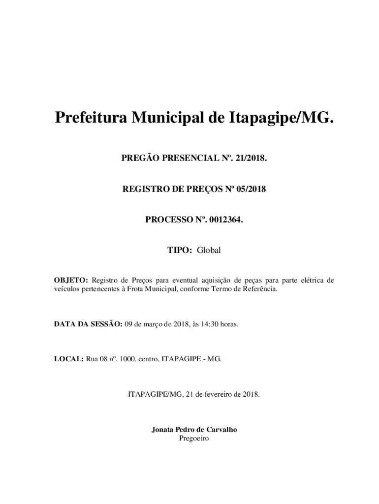 PRESO PRESENCE N. 21/2018.REGISTRY DE PRESS N 05/2018PROCESSO N. 0012364.TIP: GlobalOBJETO: Registry de Preos para eventual Aquino de peas para part Erica de