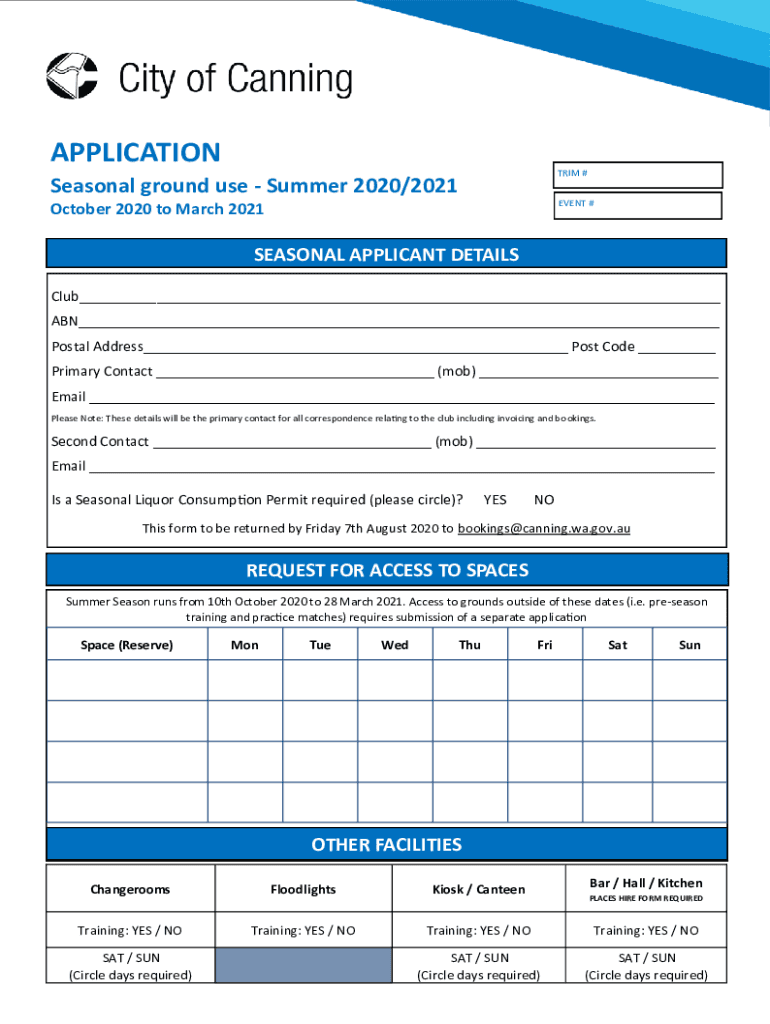 APPLICATION TRIM #Seasonal ground use Summer 2020/2021EVENT #October 2020 to March 2021SEASONAL APPLICANT DETAILS Club___ ABN___ Postal Address___ Post Code ___ Primary Contact ___ (mob) ___ Email