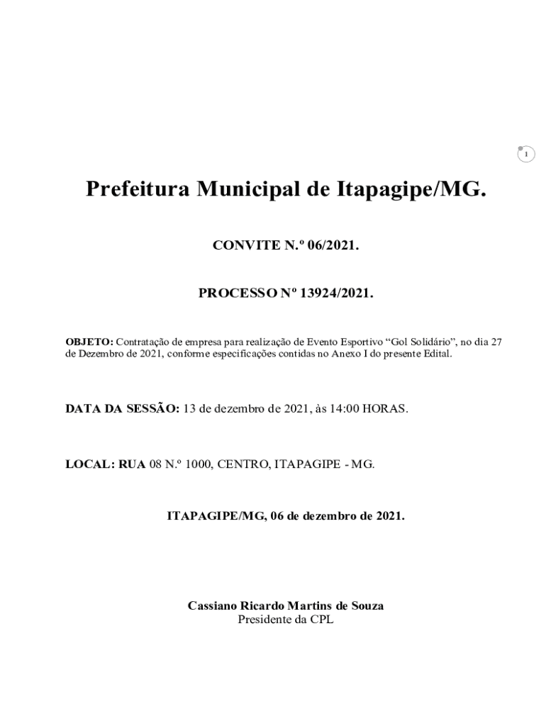 1Prefeitura Municipal de Itapagipe/MG. CONVICTED N. 06/2021. PROCESS N 13924/2021.OBJECT: Contralto DE empress para realized DE Event Sportive Go Solidi, now did 27 de December de 2021, conform specifies