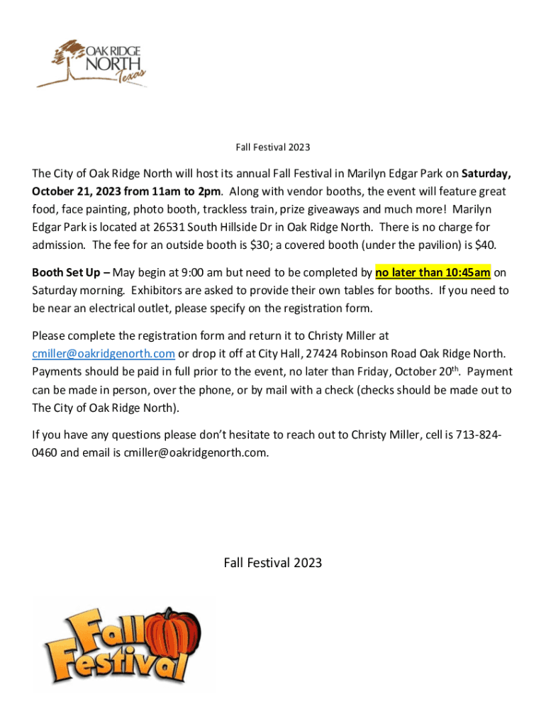 Fall Festival 2023The City of Oak Ridge North will host its annual Fall Festival in Marilyn Edgar Park on Saturday, October 21, 2023, from 11am to 2pm. Along with vendor booths, the event will feature