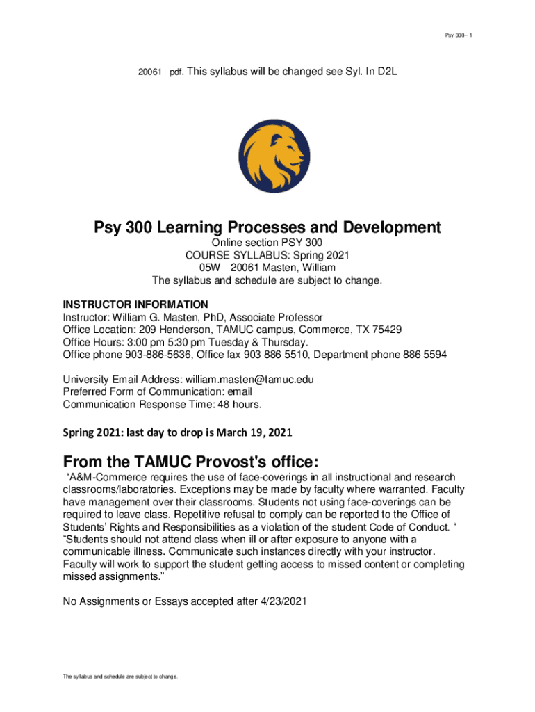 Pay 300 120061 PDF. This syllabus will be changed see SYL. In D2LPsy 300 Learning Processes and Development Online section PAY 300 COURSE SYLLABUS: Spring 2021 05W 20061 Master, William The syllabus