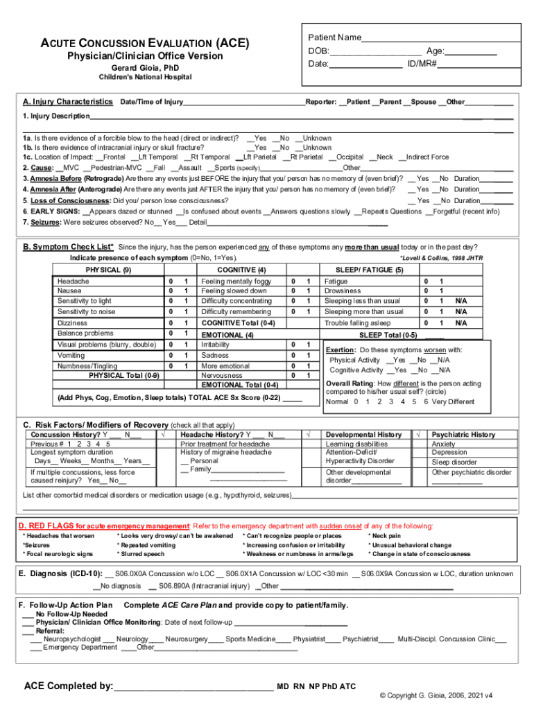 Patient Name DOB:___ Age: Date: ID/MR#ACUTE CONCUSSION EVALUATION (ACE) Physician/Clinician Office Version Gerard Iowa, Godchildren\'s National Hospital. Injury Characteristics Date/Time of InjuryReporter: