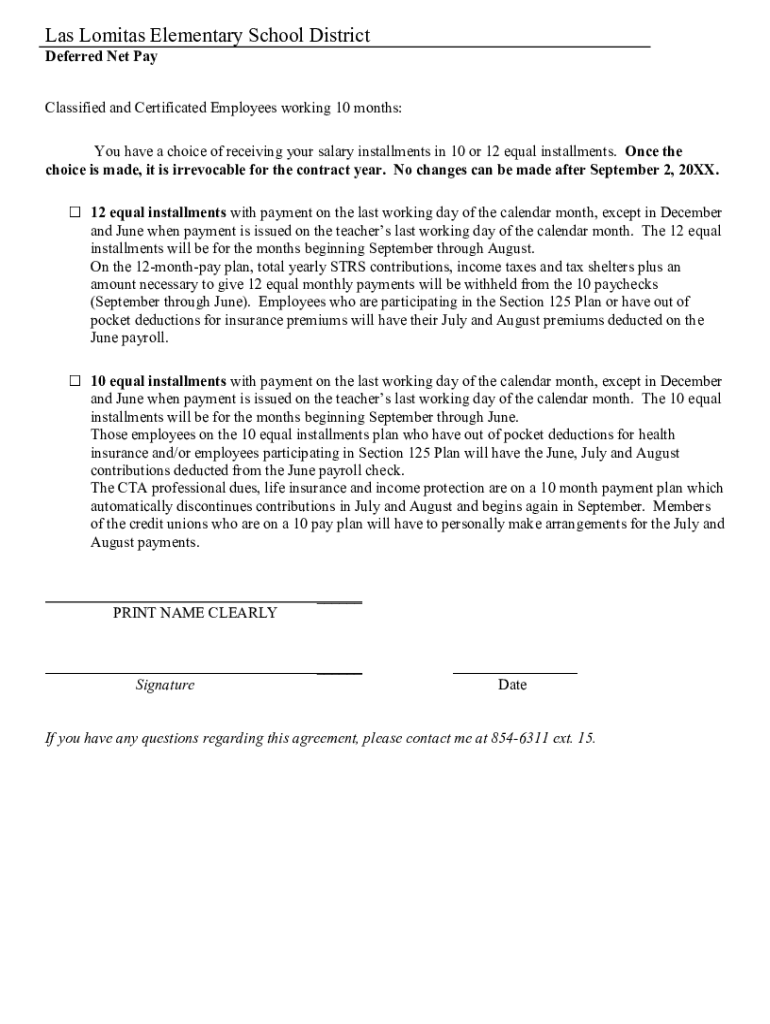 Las limit Elementary School District Deferred Net Pay Classified and Certificated Employees working 10 months: You have a choice of receiving your salary installments in 10 or 12 equal installments.