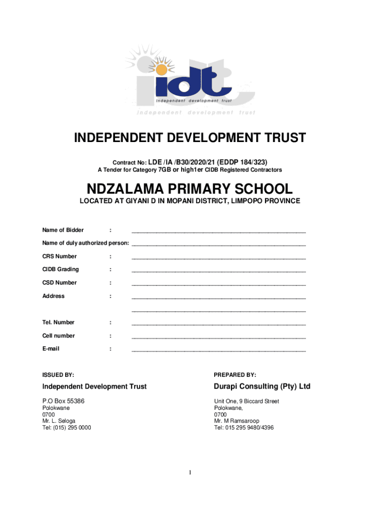 INDEPENDENT DEVELOPMENT TRUST Contract No: LDE /IA /B30/2020/21 (EDDY 184/323) A Tender for Category 7 GB or high1er CDB Registered ContractorsNDZALAMA PRIMARY SCHOOL LOCATED AT GIANT D IN MOP ANI