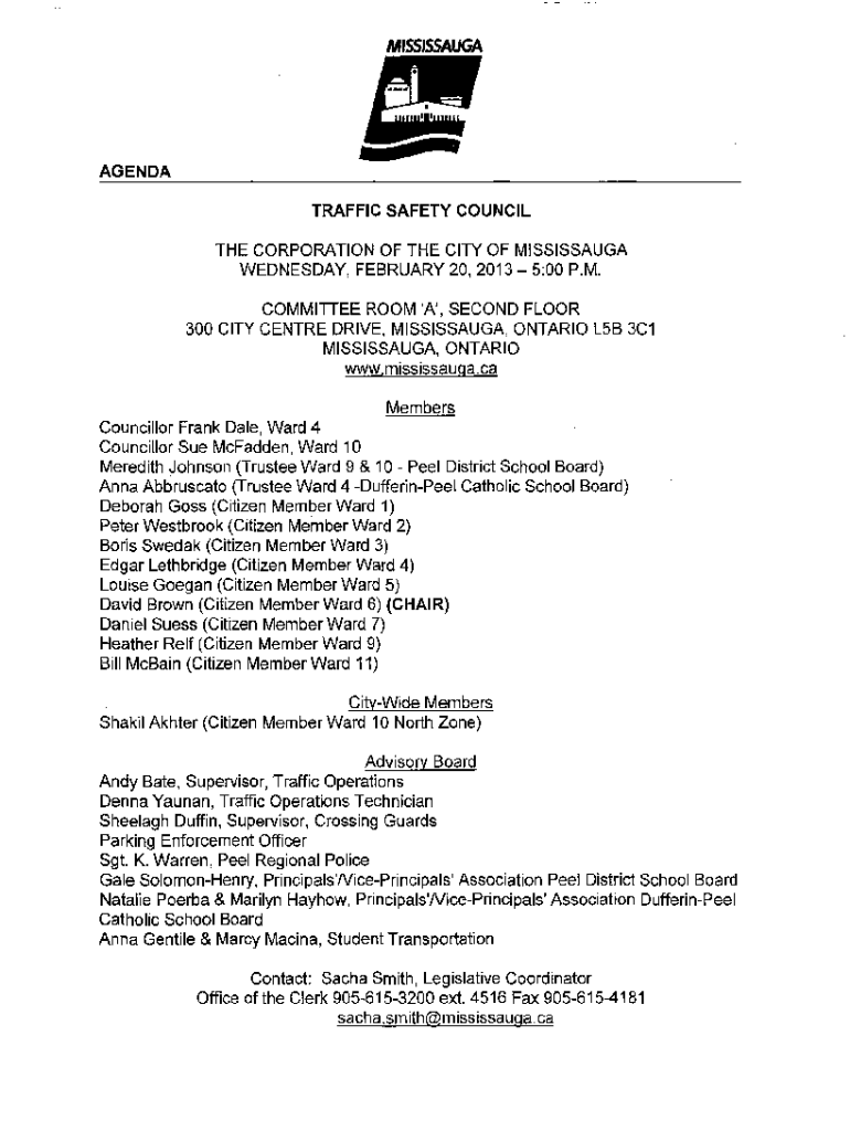 MISS/sSAUGAAGENDA TRAFFIC SAFETY COUNCIL THE CORPORATION OF THE CITY OF MISSISSAUGA WEDNESDAY, FEBRUARY 20, 2013 5:00 P.M.COMMITTEE ROOM \'A\', SECOND FLOOR 300 CITY Center DRIVE, MISSISSAUGA, ONTARIO