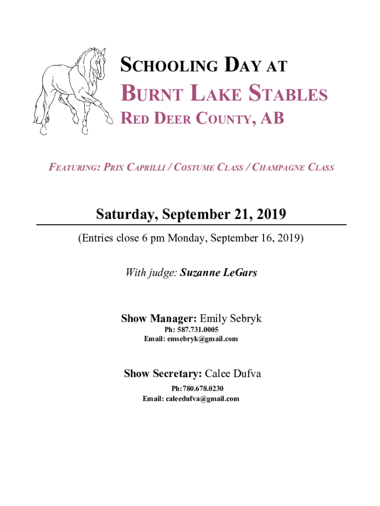 SCHOOLING DAY BURNT LAKE STABLES RED DEER COUNTY, AB FEATURING: PRI CARRILLO / COSTUME CLASS / CHAMPAGNE CLASS Saturday, September 21, 2019 (Entries close 6 pm Monday, September 16, 2019) With judge: