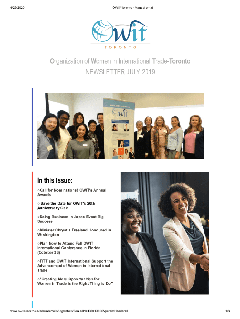 4/29/2020OWITToronto Manual emailOrganization of Women in International Trade Toronto NEWSLETTER JULY 2019In this issue: Call for Nominations! WIT\'s Annual Awards Save the Date for WIT\'s 20th Anniversary