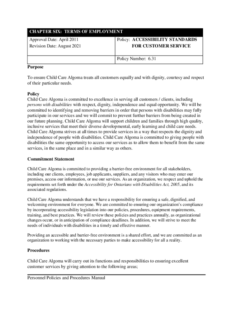 CHAPTER SIX: TERMS OF EMPLOYMENT Approval Date: April 2011 Revision Date: August 2021Policy: ACCESSIBILITY STANDARDS FOR CUSTOMER SERVICE Policy Number: 6.31Purpose To ensure Child Care Alma treats