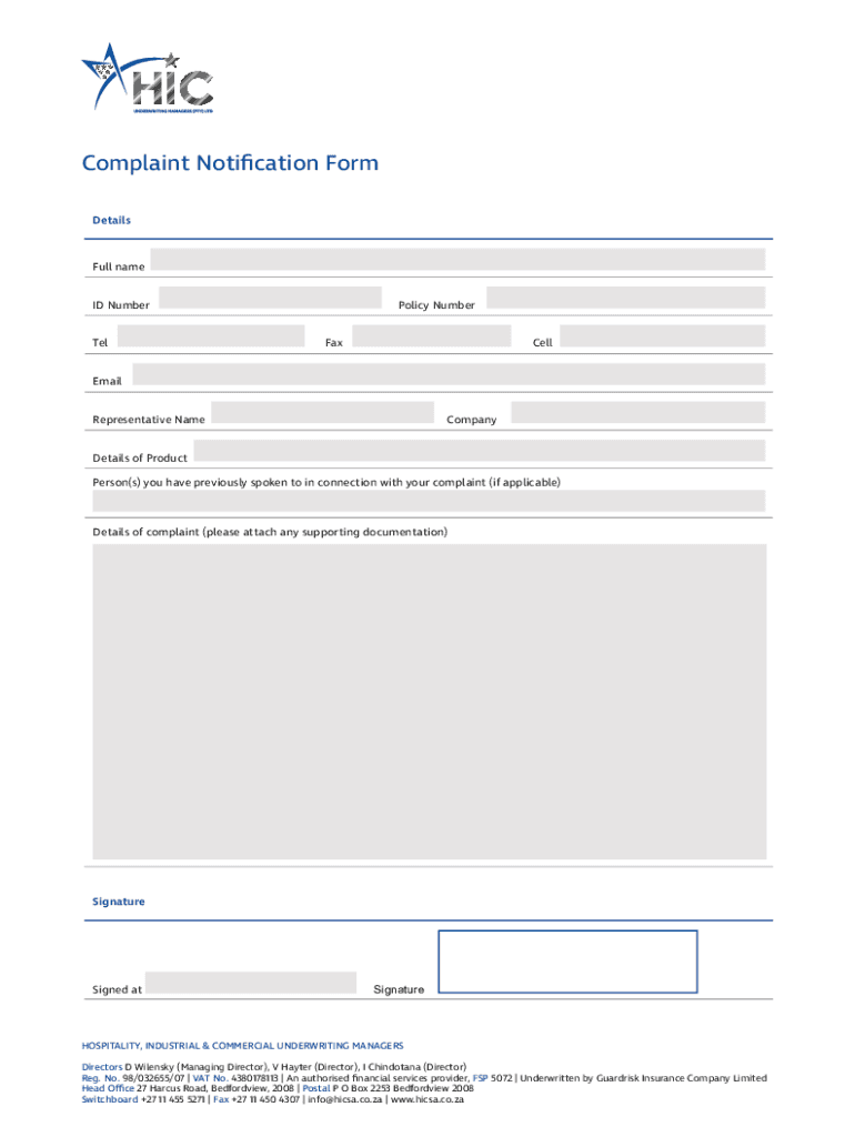 Submit by emailComplaint Notification Form DetailsFull name ID Number Policy NumberFaxCellEmailRepresentative NameCompanyDetails of Product Person(s) you have previously spoken to in connection with
