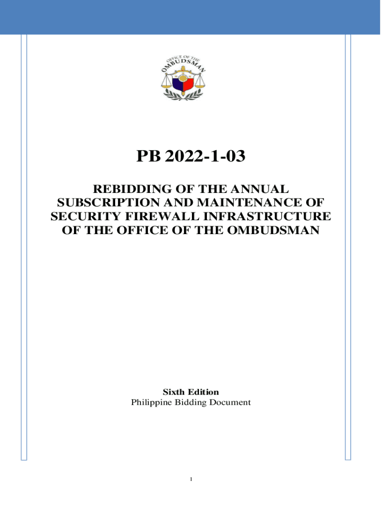 PB 2022103 REBIDDING OF THE ANNUAL SUBSCRIPTION AND MAINTENANCE OF SECURITY FIREWALL INFRASTRUCTURE OF THE OFFICE OF THE OMBUDSMANSixth Edition Philippine Bidding Document1Table of Contents Glossary