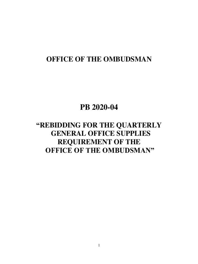 OFFICE OF THE OMBUDSMAN PB 202004 REBIDDING FOR THE QUARTERLY GENERAL OFFICE SUPPLIES REQUIREMENT OF THE OFFICE OF THE OMBUDSMAN1TABLE OF CONTENTS SECTION I. INVITATION TO BID ............................................................................3