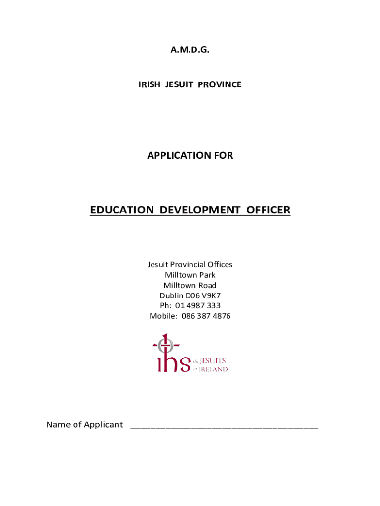 A.M.D.G.IRISH JESUIT PROVINCEAPPLICATION COEDUCATION DEVELOPMENT OFFICER Jesuit Provincial Offices Miltown Park Miltown Road Dublin D06 V9K7 pH: 01 4987 333 Mobile: 086 387 4876Name of Applicant ___Application