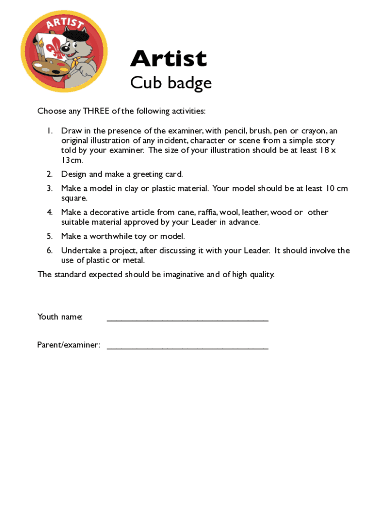 Artist Cub badge Choose any THREE of the following activities: 1. Draw in the presence of the examiner, with pencil, brush, pen or crayon, an original illustration of any incident, character or scene