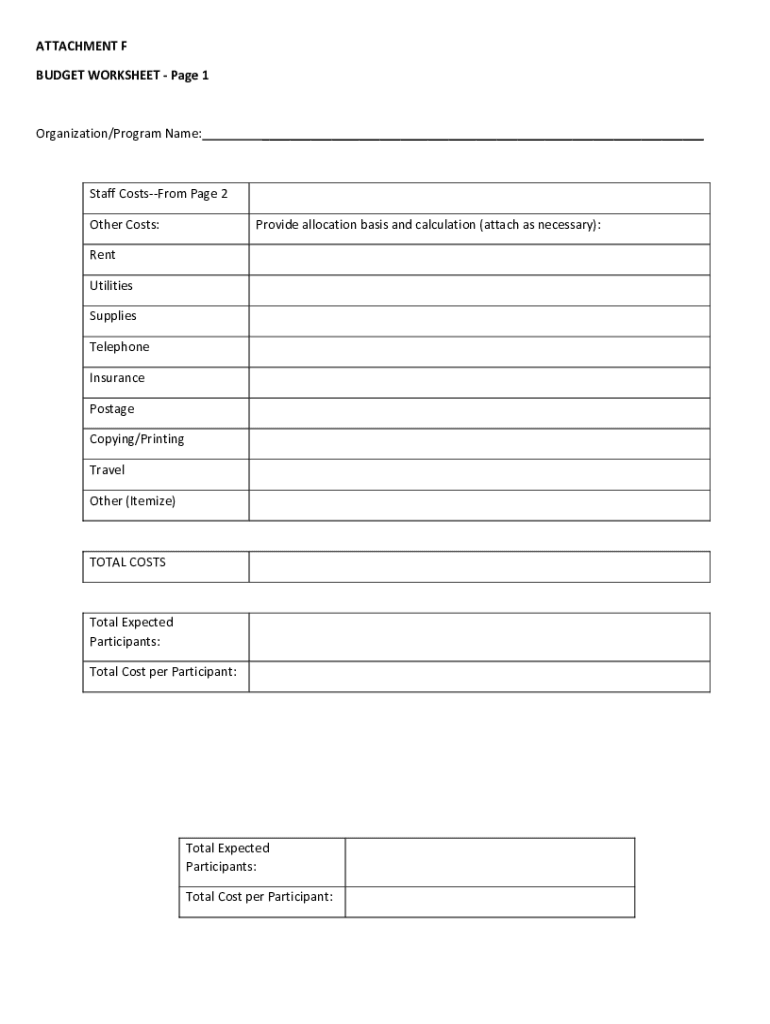 ATTACHMENT F BUDGET WORKSHEET Page 1Organization/Program Name:___Staff CostsFrom Page 2 Other Costs:Provide allocation basis and calculation (attach as necessary):Rent Utilities Supplies Telephone