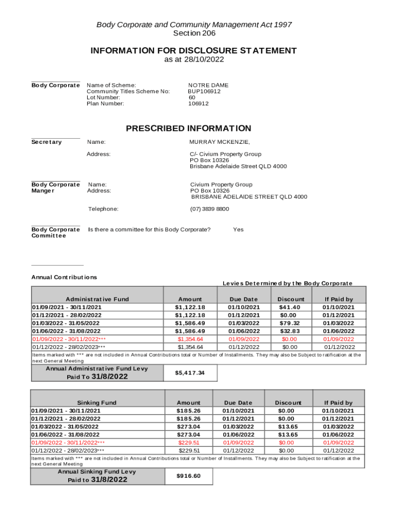 Body Corporate and Community Management Act 1997 Section 206INFORMAT ION FOR DISCLOSURE ST AT EVENT as at 28/10/2022___ Body Corporate Name of Scheme:NOTE DAMECommunity Titles Scheme No:BUP106912Lot